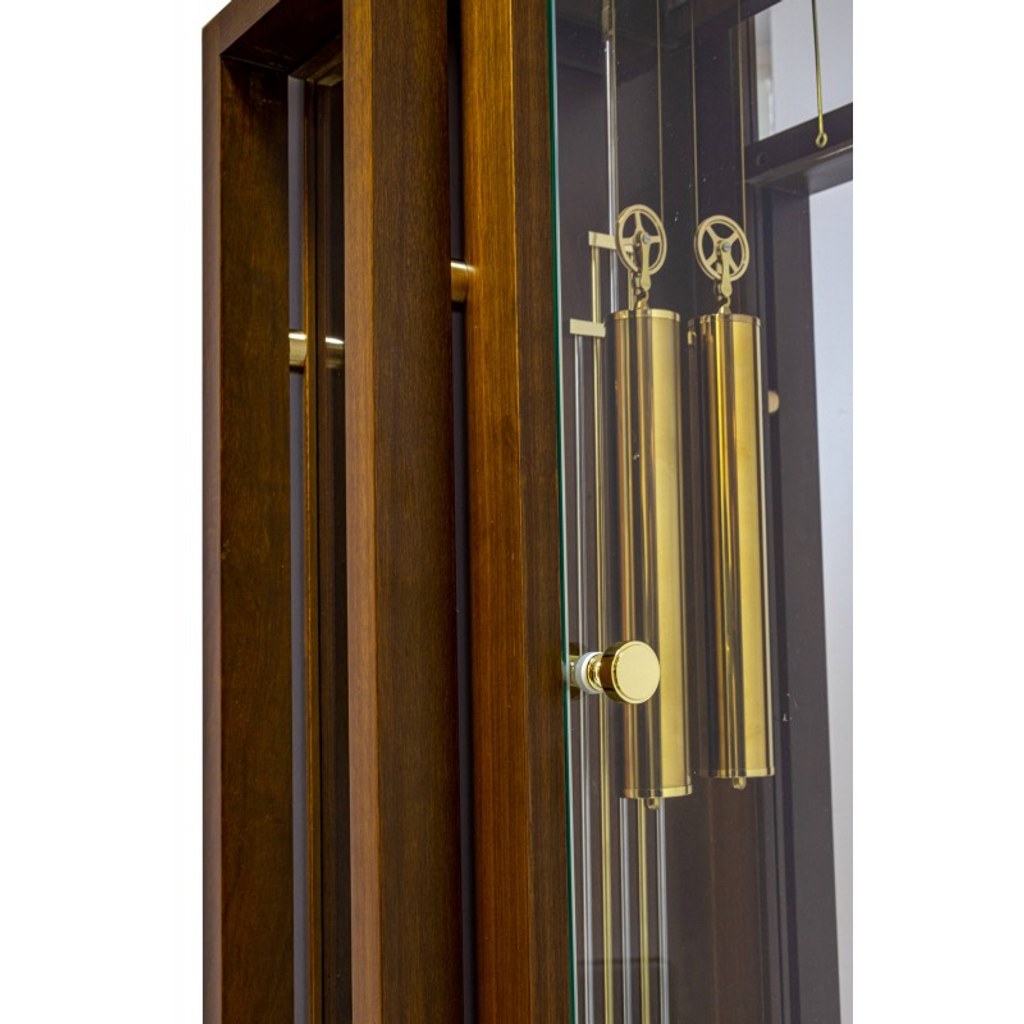 Materiál: dřevo / ořech - kov - sklo Kvalitně zpracovaná skříň Půlový - závažový německý stroj Hermle V půl bijí 1x, v celou počet hodin 1x-12x Bití 2-tónové BIM-BAM Hodiny mají možnost vypínání bití