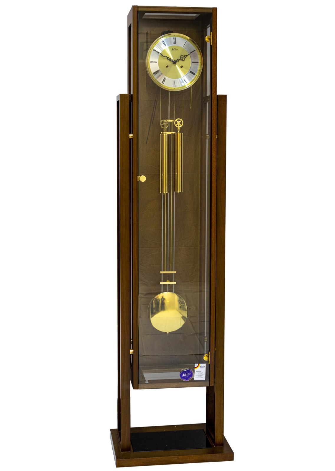 Mechanické hodiny Adler 10159 jsou vyrobeny dle hodin, které se vyráběly v době našich babiček. Můžete v nich spatřit kouzlo historie. Na výrobu skříně je použito dřevo, které je špičkově opracováno. Stroje jsou celokovové, mechanické, půlové - to znamená, že vám budou nejen dlouho sloužit, ale také pravidelně odbíjet v půl 1x a v celou hodinu dle toho kolik je hodin. V případě potřeby je možné odbíjení vypínat. Tyto hodiny se přiloženou kličkou. Jedním se natahuje chod stroje a druhým bití. Tento stroj vyrobila německá firma Hermle.