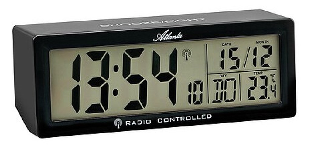 Digitální rádiem řízený budík s dotykovým senzorem, osvětlením, opakovaným buzením, teplotou, datem a regulací hlasitosti