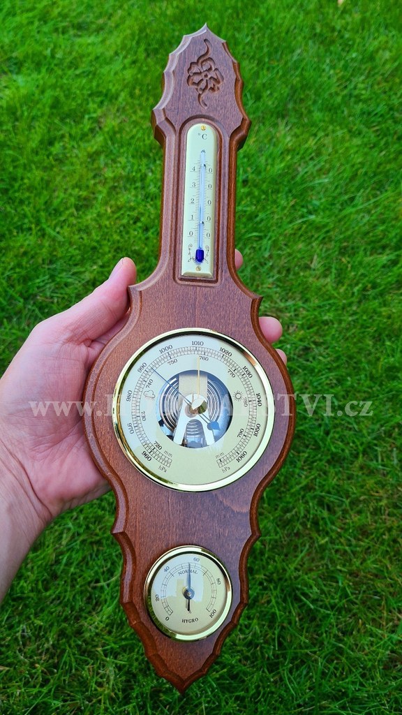 Barometr s teploměrem a vlhkoměrem na dřevěné podložce B203023