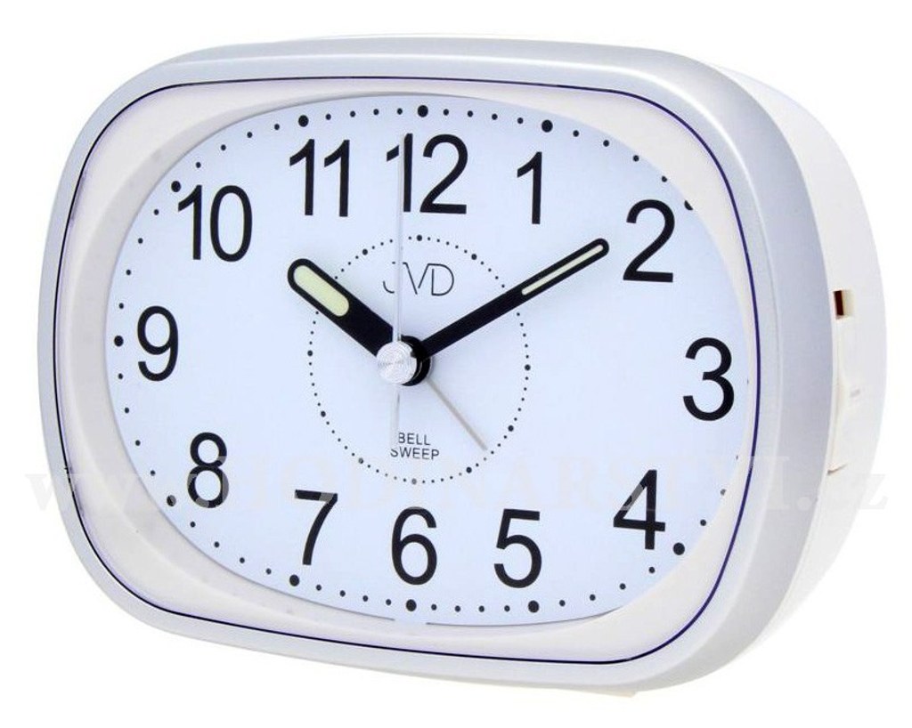Plynulý chod vteřinové ručičky - hodiny netikají Funkce: čas, osvětlení ciferníku, budík, mechanické zvonění, opakované zvonění po 4 minutách, plynulý chod Materiál: plast Bateriový pohon