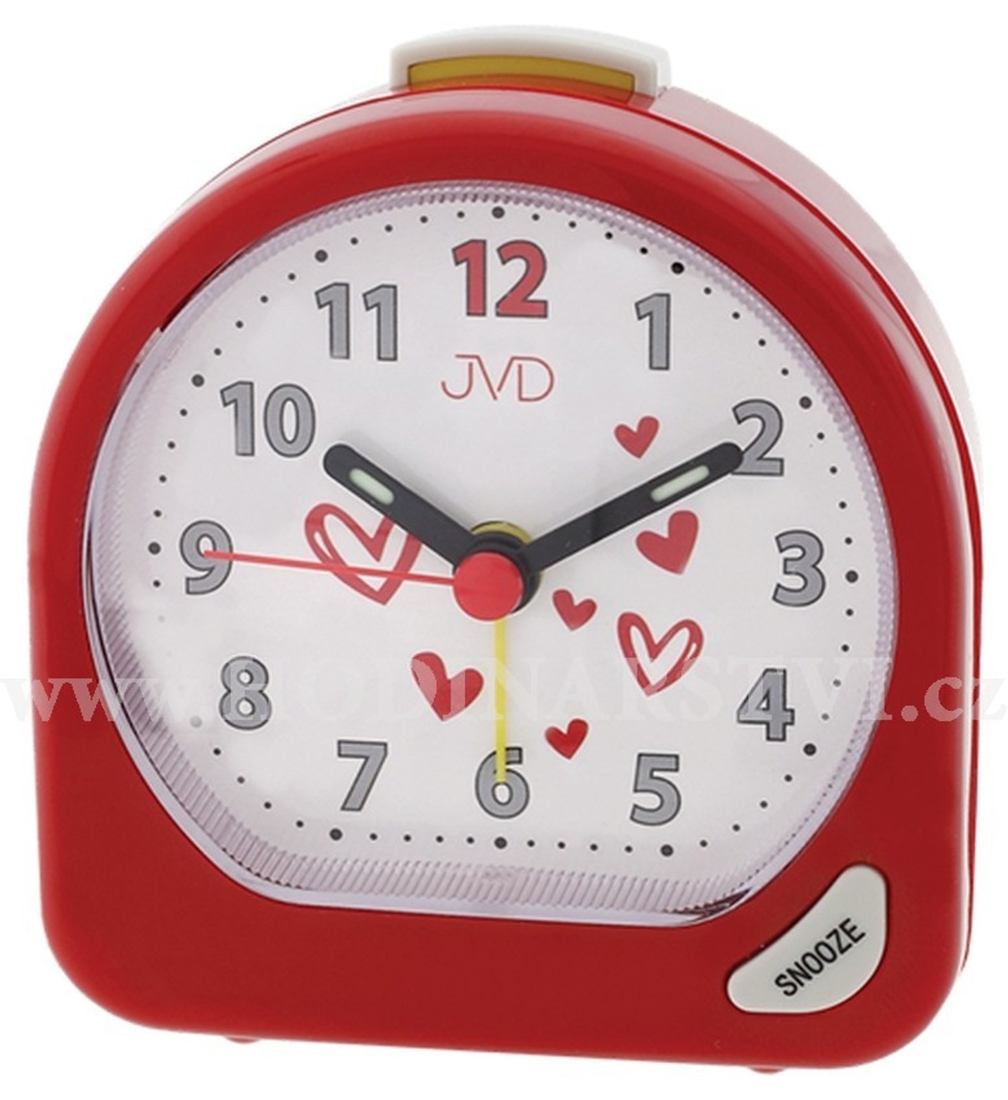 Klasický ručičkový budík pro děti JVD SR672. Funkce: čas, budík, osvětlení, opakování zvonění po 4 minutách, postupné zesilování zvonění