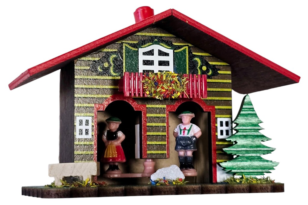 Barometr v podobě dřevěné pestrobarevné chaloupky. Bude-li hezky, z chaloupky vystoupí panenka. Bude-li ošklivé počasí, ukáže se panáček. Určeno do vnitřních prostor.