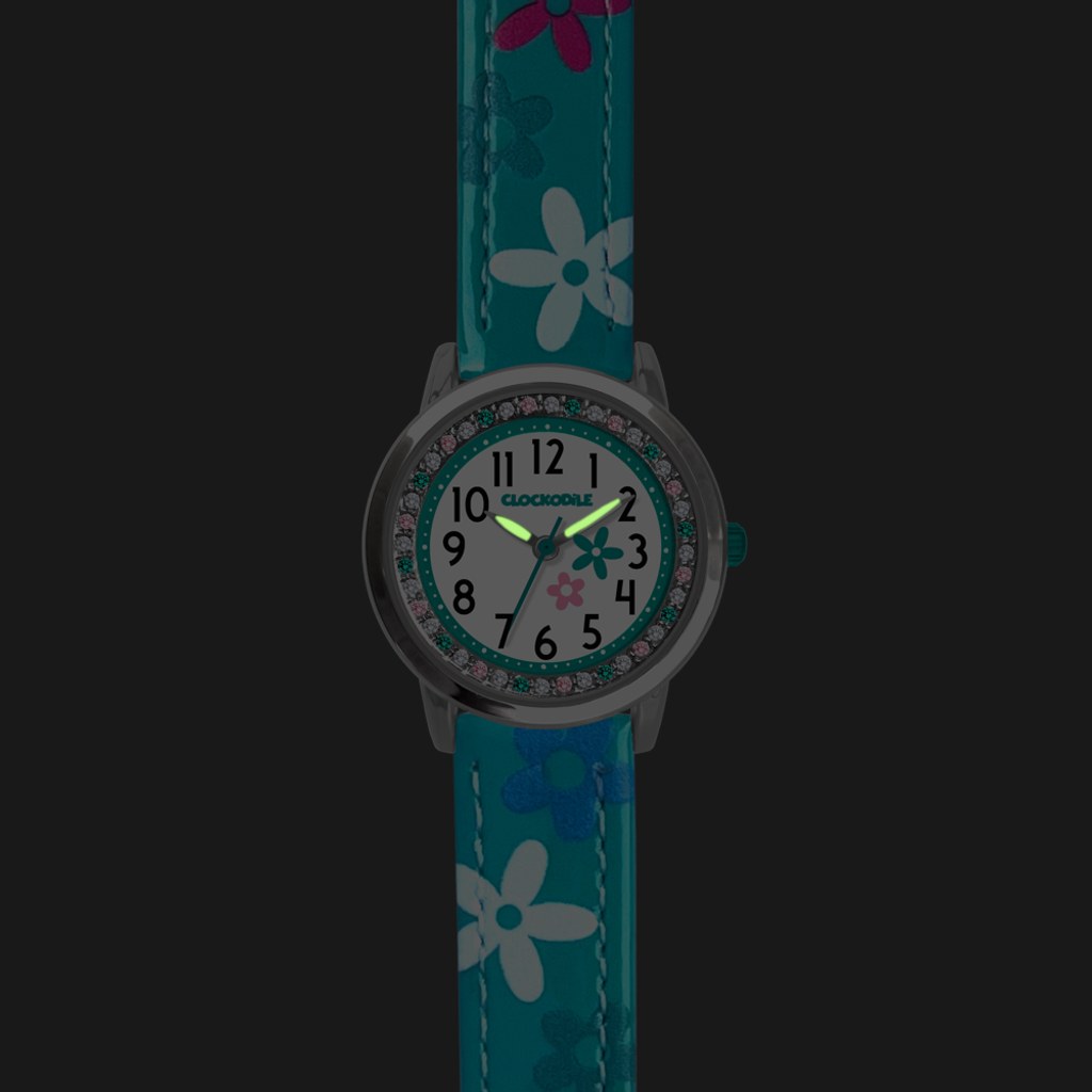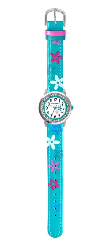 CLOCKODILE Tyrkysové dívčí dětské hodinky s kamínky a kytičkami