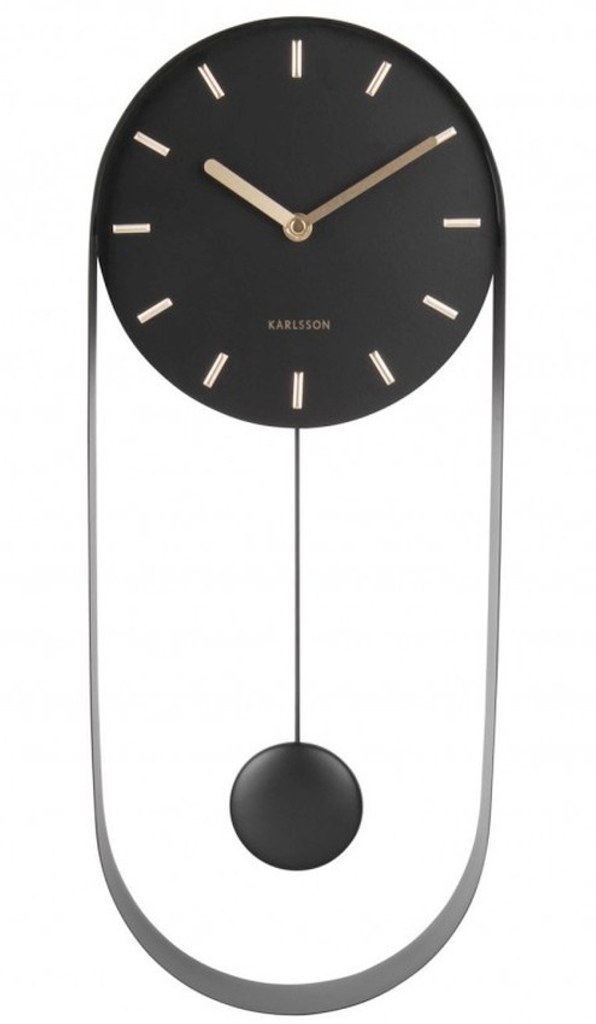Kyvadlové kovové lakované hodiny v čistém minimalistickém designu s kovovými indexy a ručičkami.