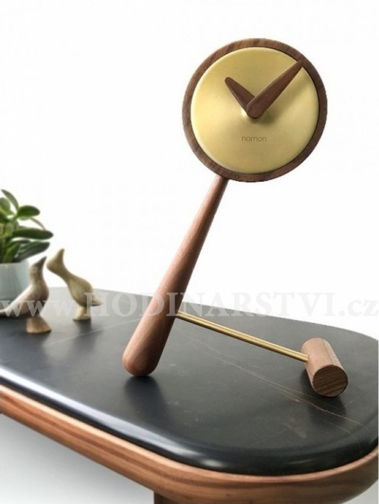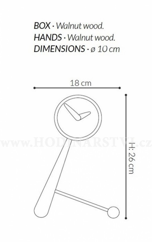 Materiál: mosaz, dřevo Průměr ciferníku: 10 cm Celková výška hodin: 26 cm Tichý chod - hodiny netikají Napájení: baterie
