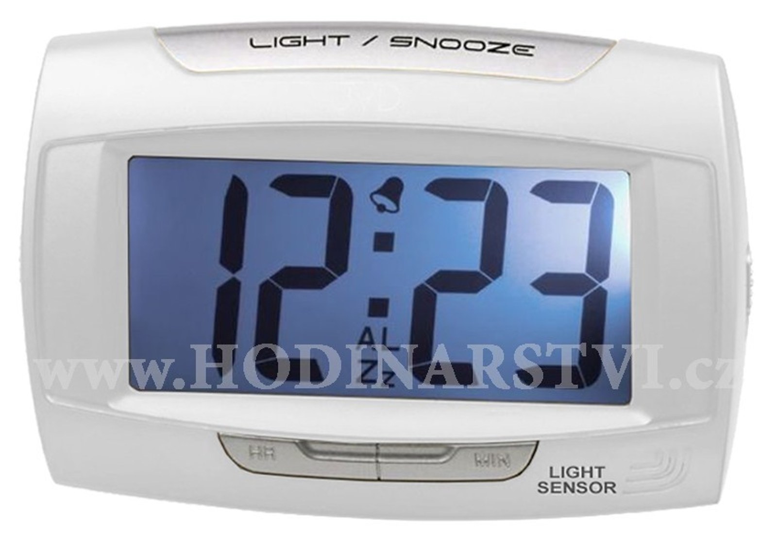 Moderní digitální budík značky JVD se světelným čidlem, který samovolně reguluje zapnutí podsvětlení displeje po setmění.