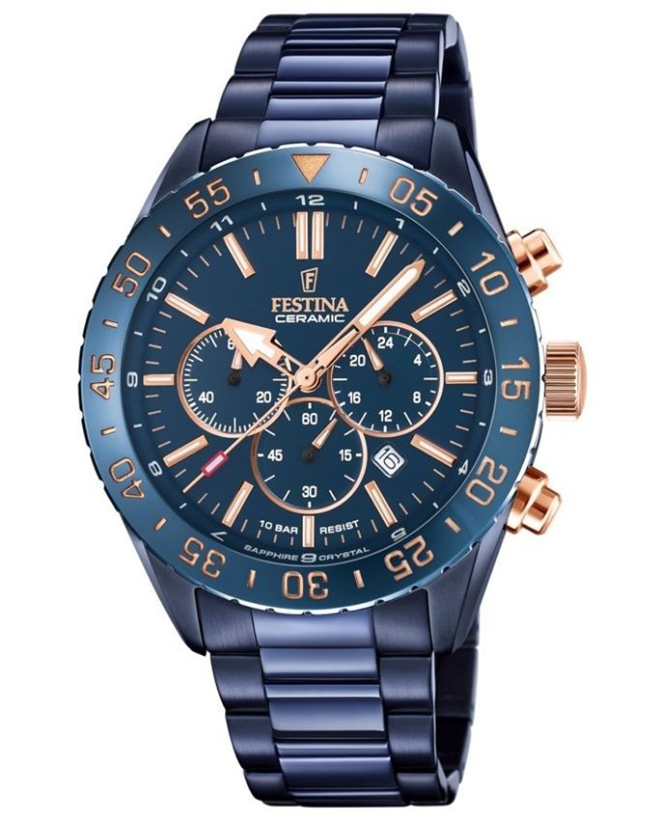 Pánské hodinky s chronografem z kolekce Ceramic. Ocelové pouzdro je technologií PVD zbarveno do modra, osazeno safírovým sklem a keramickou lunetou. Díky vodotěsnosti 10 Atm se můžete s hodinkami potápět bez přístroje.