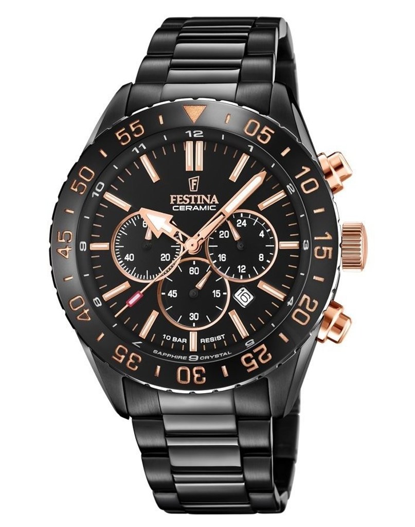 Pánské hodinky s chronografem z kolekce Ceramic. Ocelové pouzdro je technologií PVD zbarveno do tmavě černé, osazeno safírovým sklem, keramickou lunetou a doplněno o korunky v barvě růřového zlata. Díky vodotěsnosti 10 Atm se můžete s hodinkami potápět bez přístroje.