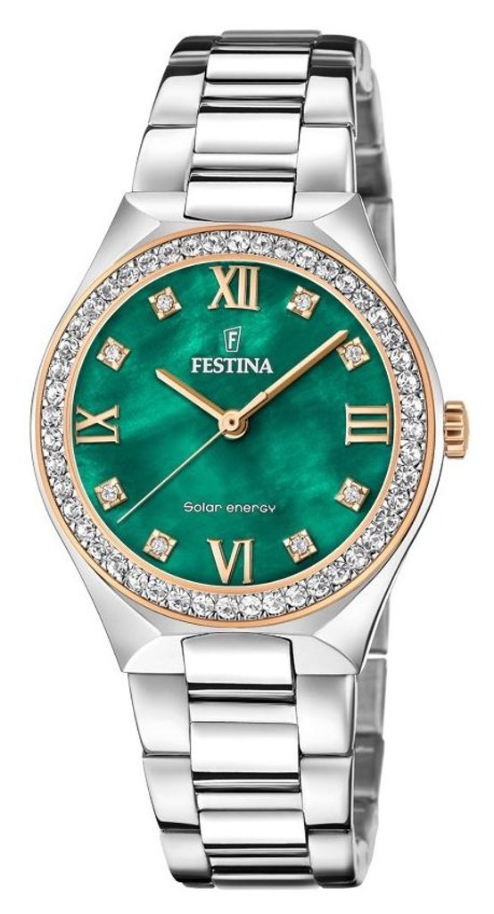 Dámské hodinky na ocelovém tahu zaujmou svým zeleným perleťovým číselníkem a lunetou s PVD úpravou v barvě růžového zlata osazenou zirkony. Své majitelky potěší zejména solárním napájením, díky kterému odpadá nutnost časté výměny baterie.