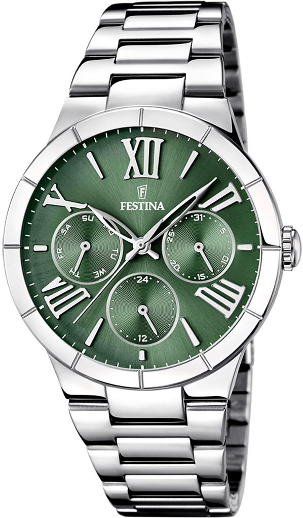 Dámské hodinky na ocelovém tahu poháněné baterií. Na zeleném číselníku zobrazují kromě aktuálního času také datum, den v týdnu a 24h subciferník. Disponují vodotěsností 50 metrů.