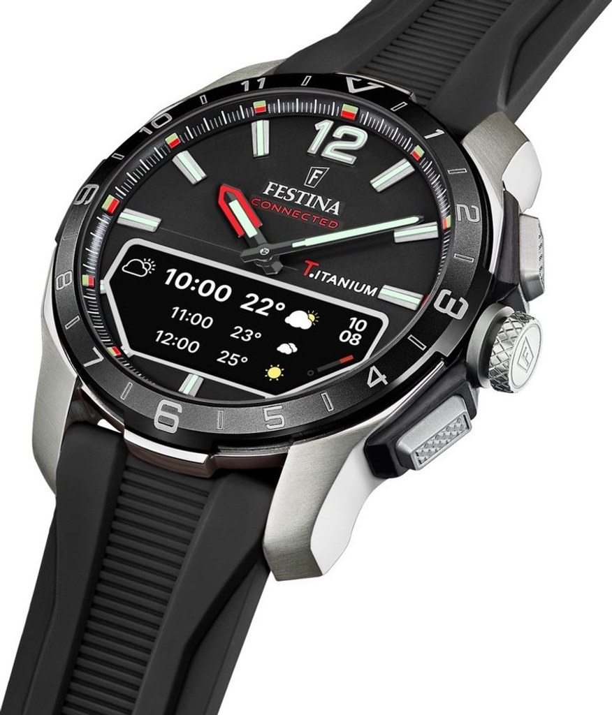 Chytré hodinky Festina s napájecím článkem a možností propojení s chytrým telefonem pomocí Bluetooth, což uživateli nabídne mnoho užitečných funkcí. Na titanové pouzdro plynule navazuje silikonový řemínek černé barvy. Číselník je chráněn safírovým sklem.