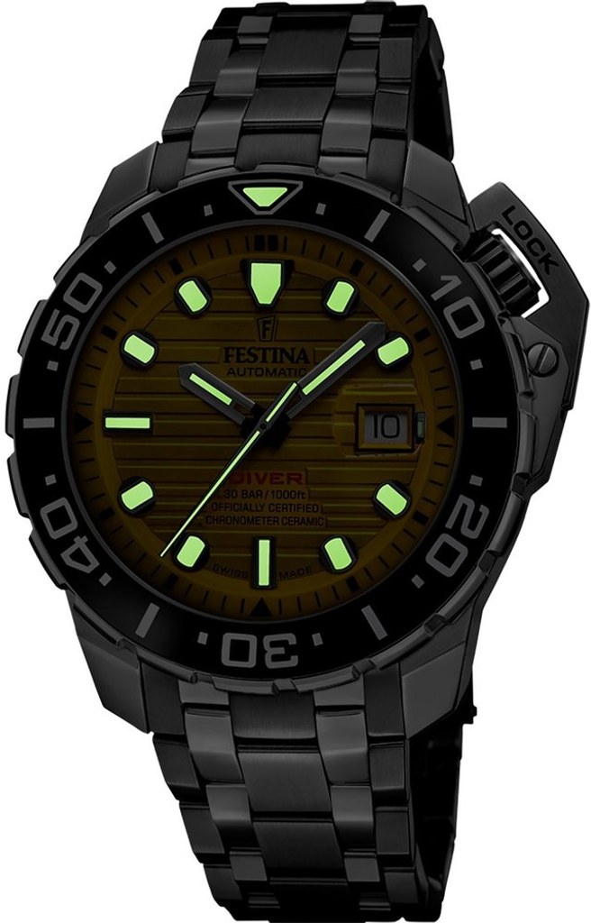 Pánské potápěčské automatické hodinky na ocelovém náramku vodotěsné do 300 m. Chod hodinek zajišťuje mechanický strojek Soprod Newton s automatickým nátahem, rezervou chodu 44 hodin a s C.O.S.C. certifikací. V krabičce je náhradní silikonový řemínek.