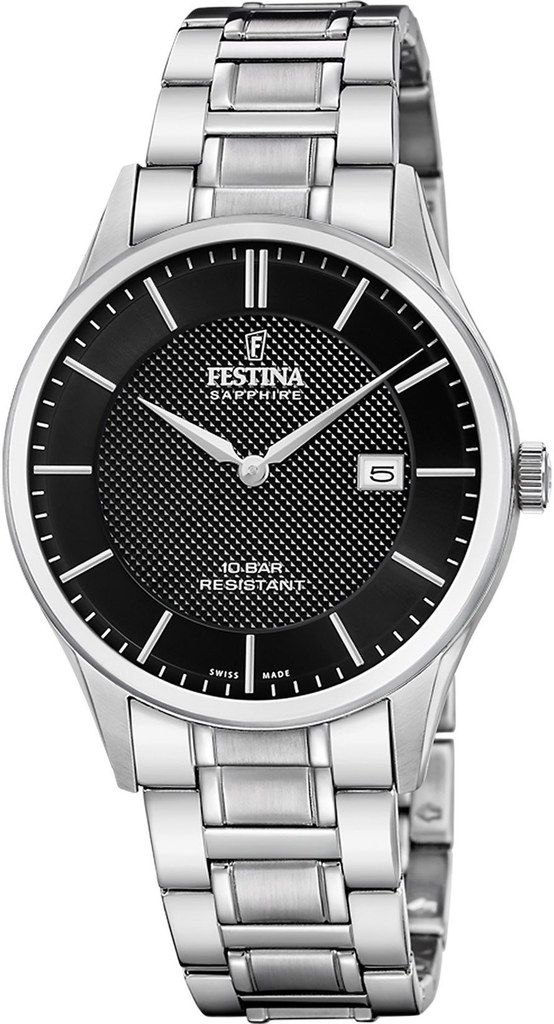 Pánské bateriové hodinky v klasickém stylu na ocelovém náramku. Černý texturovaný číselník s datumovkou je chráněn safírovým sklem.