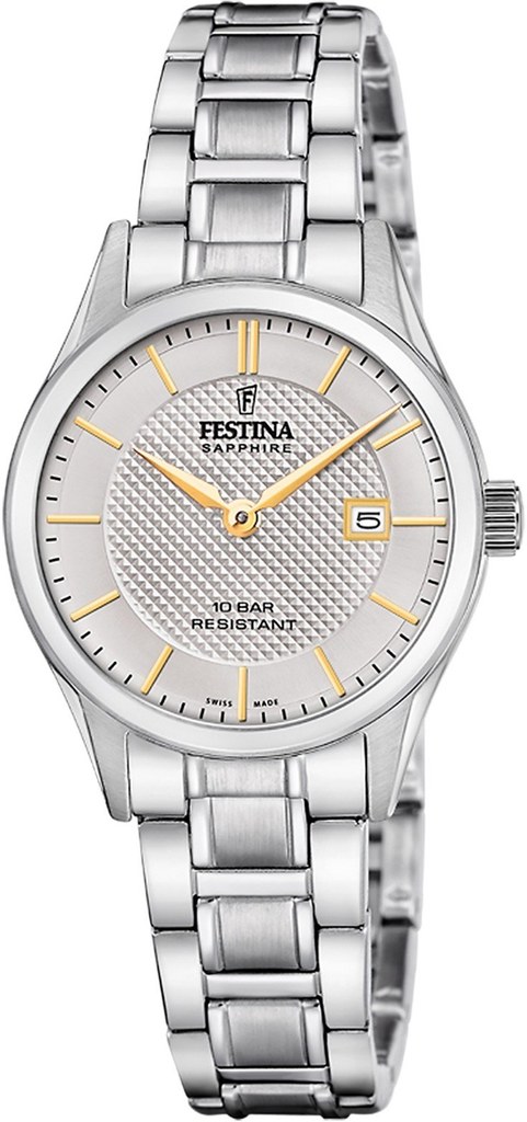 Dámské bateriové hodinky v klasickém stylu na ocelovém náramku. Stříbrný texturovaný číselník s datumovkou a zlatými detaily je chráněn safírovým sklem.
