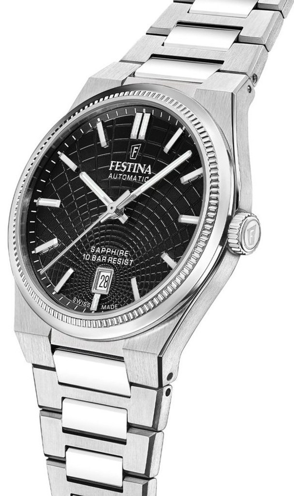 Pánské hodinky na ocelovém tahu s vodotěsností 100 metrů. Černý texturovaný číselník s datumovkou je chráněn safírovým sklem. Průhledné zadní dýnko odhaluje mechanický strojek s automatickým nátahem.