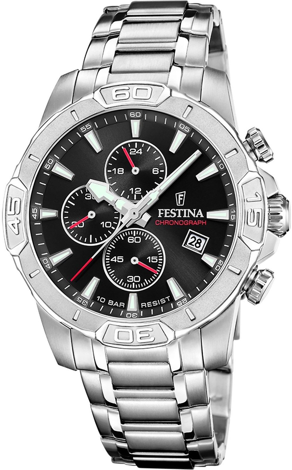 Pánské sportovní bateriové hodinky na ocelovém náramku s ocelovým pouzdrem o průměru 45 milimetrů. Černý číselník s ukazatelem času ve 24hodinovém formátu, stopkami a datumovkou je chráněn minerálním sklem.