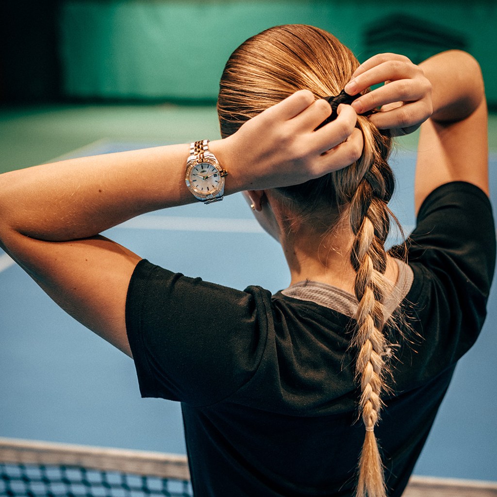 Elegantní sportovní model, inspirovaný tenisovou symbolikou, přichází na trh s výraznými černými indexy s 12 diamanty o velikosti 1,2 mm Si1. Ciferník je vyroben z perleti, což mu dodává irizující, luxusní vzhled. Detailní zpracování, jako jsou aplikované indexy a precizní zasazení diamantů.