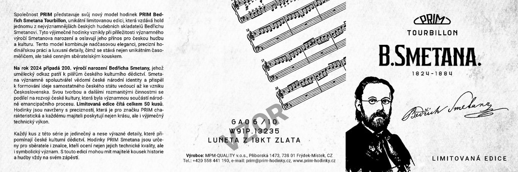 Společnost PRIM představuje svůj nový model hodinek PRIM Tourbillon Bedřich Smetana, unikátní limitovanou edici, která vzdává hold jednomu z nejvýznamnějších českých hudebních skladatelů Bedřichu Smetanovi. Tyto výjimečné hodinky vznikly při příležitosti významného výročí Smetanova narození a oslavují jeho přínos pro českou hudbu a kulturu. Tento model kombinuje nadčasovou eleganci, precizní hodinářskou práci a luxusní detaily, čímž se stává nejen unikátním časoměřičem, ale také cenným sběratelským kouskem.
