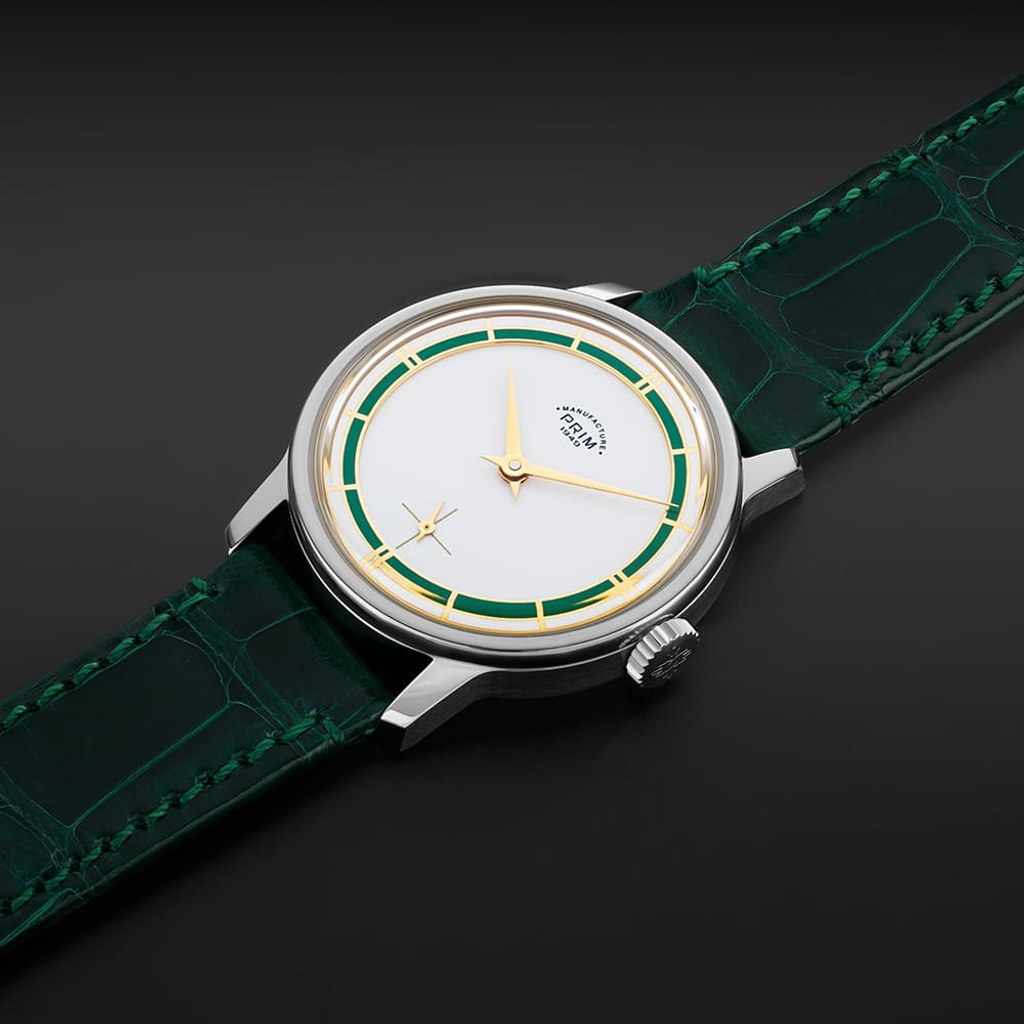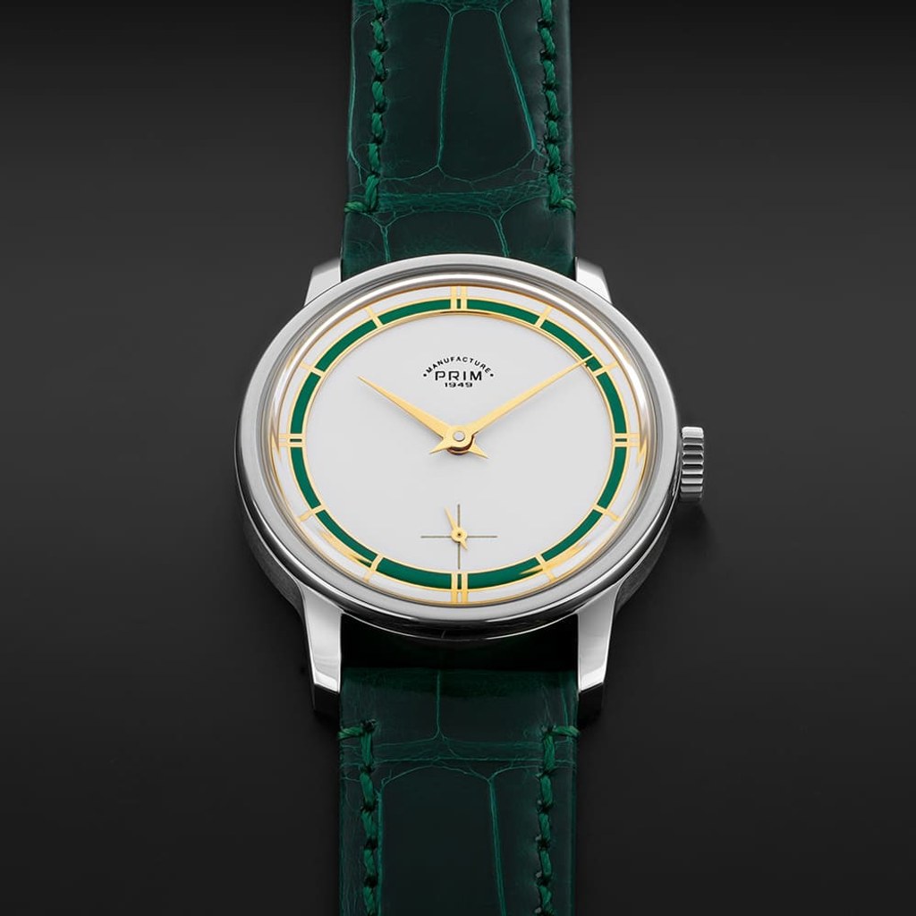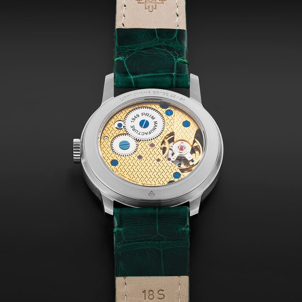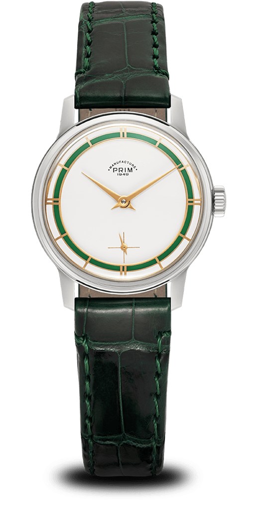Nejvýraznějším prvkem designu limitované edice PRIM Traktor 34 je bezpochyby propracovaný skládaný číselník. Kontrastní keramická objímka v atraktivní zelené barvě působivě vyniká na bílém podkladu. Elegantní vzhled hodinek je doladěn decentními zlacenými indexy a mimostřednou sekundovou ručkou, typickou pro původní model. Nově navržené pouzdro o průměru 34 mm je svou velikostí a tvarem ideální pro každodenní nošení.