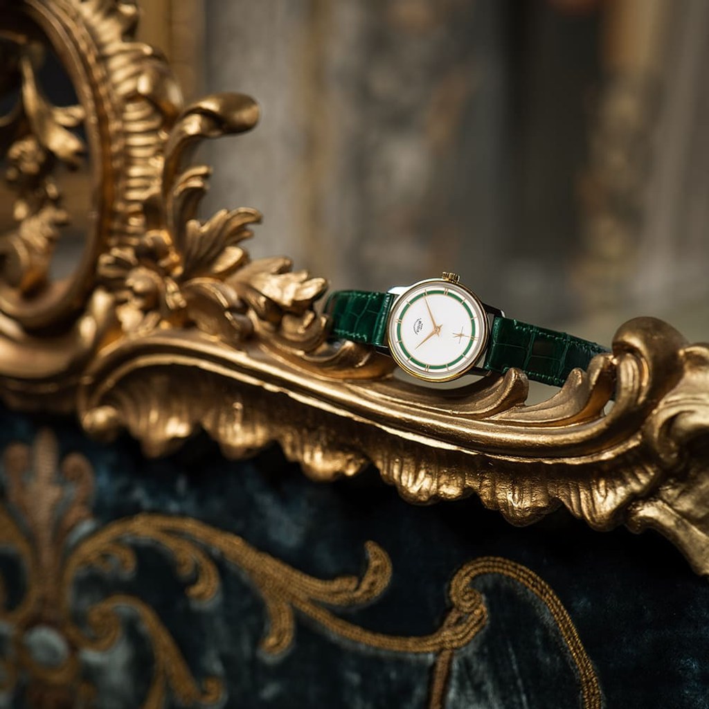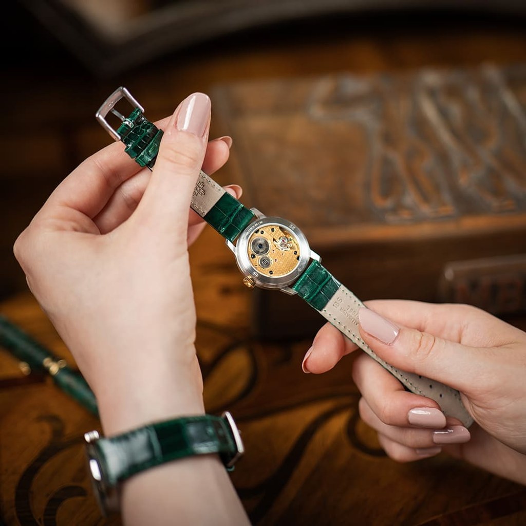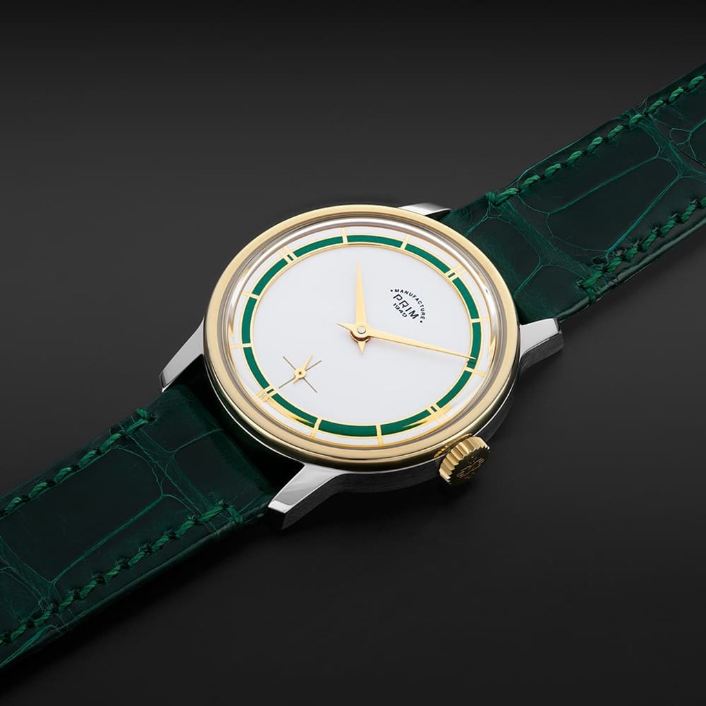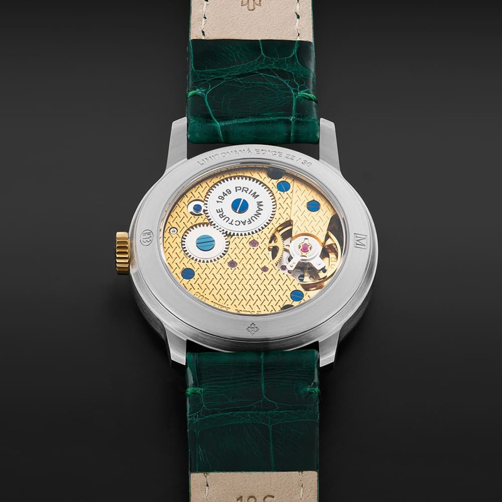 Nejvýraznějším prvkem designu limitované edice PRIM Traktor 34 je bezpochyby propracovaný skládaný číselník. Kontrastní keramická objímka v atraktivní zelené barvě působivě vyniká na bílém podkladu. Elegantní vzhled hodinek je doladěn decentními zlacenými indexy a mimostřednou sekundovou ručkou, typickou pro původní model. Nově navržené pouzdro o průměru 34 mm je svou velikostí a tvarem ideální pro každodenní nošení.