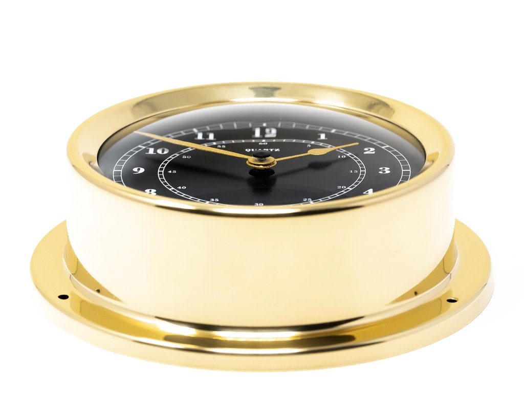Materiál: nerez ocel, mosaz Barva: černá, zlatá Pohon: Quartzový strojek Průměr: 12,5 cm Made in Germany