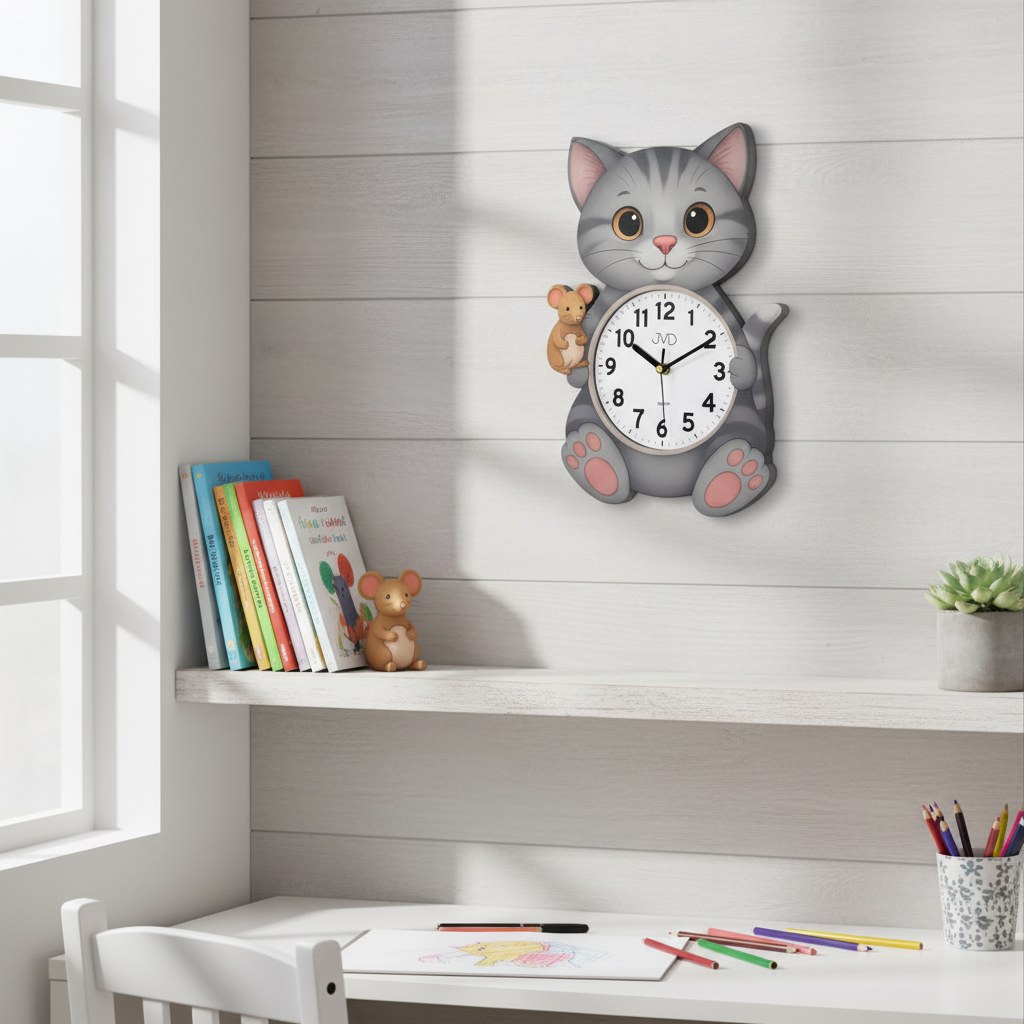 Krásné nástěnné hodiny JVD pro malé kluky i holky. Díky číslicím a výrazným ručičkám jsou hodiny vhodné i pro učení správného času.