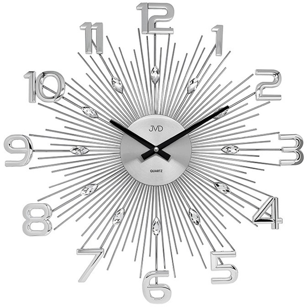 Hodiny HT108, jejichž pravidelné čáry připomínají paprsky slunce, zdobeny jsou kameny v kapkovitém tvaru a velká výrazná čísla ve stříbrné barvě. Skvěle doladí váš interiér.