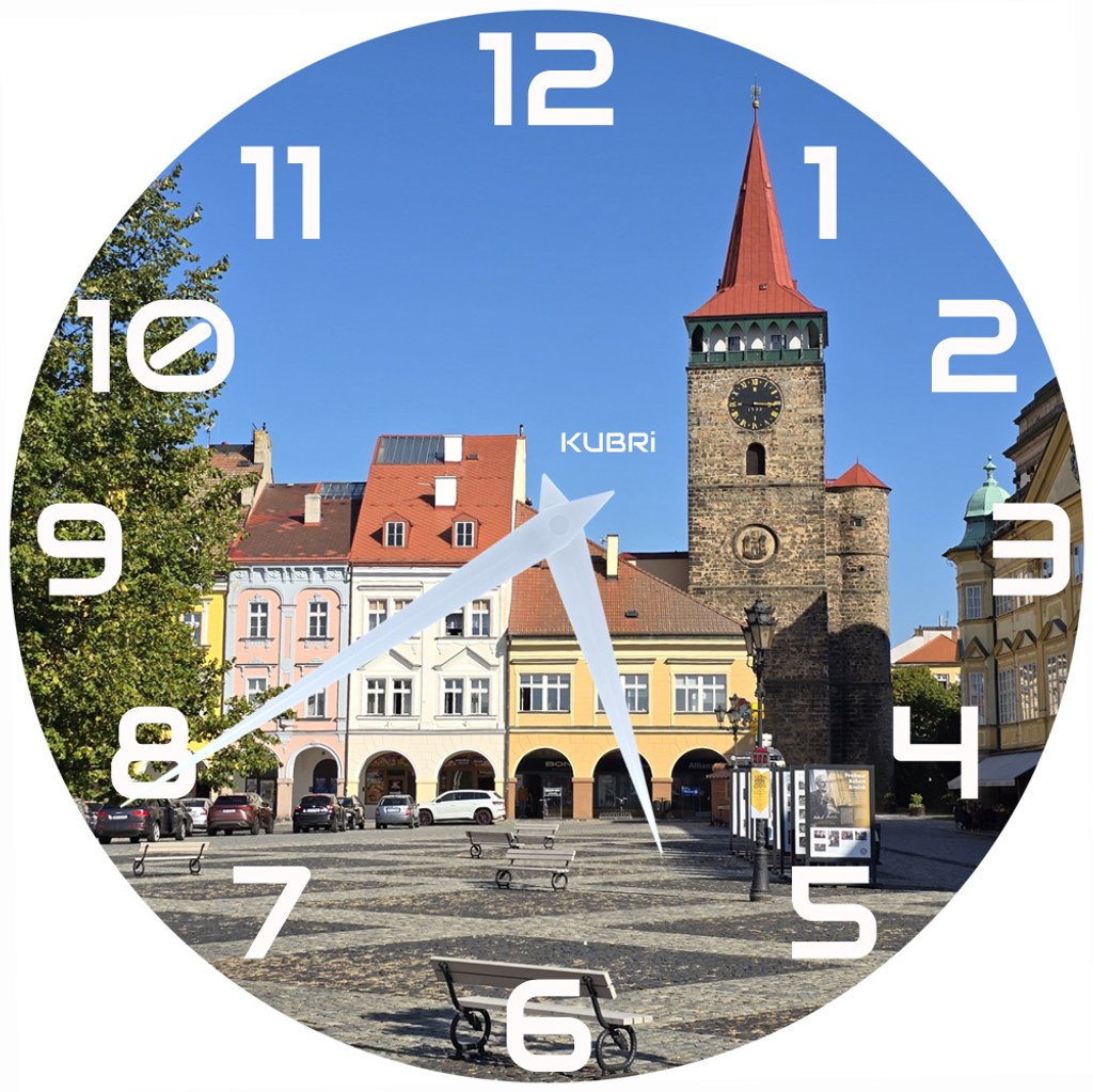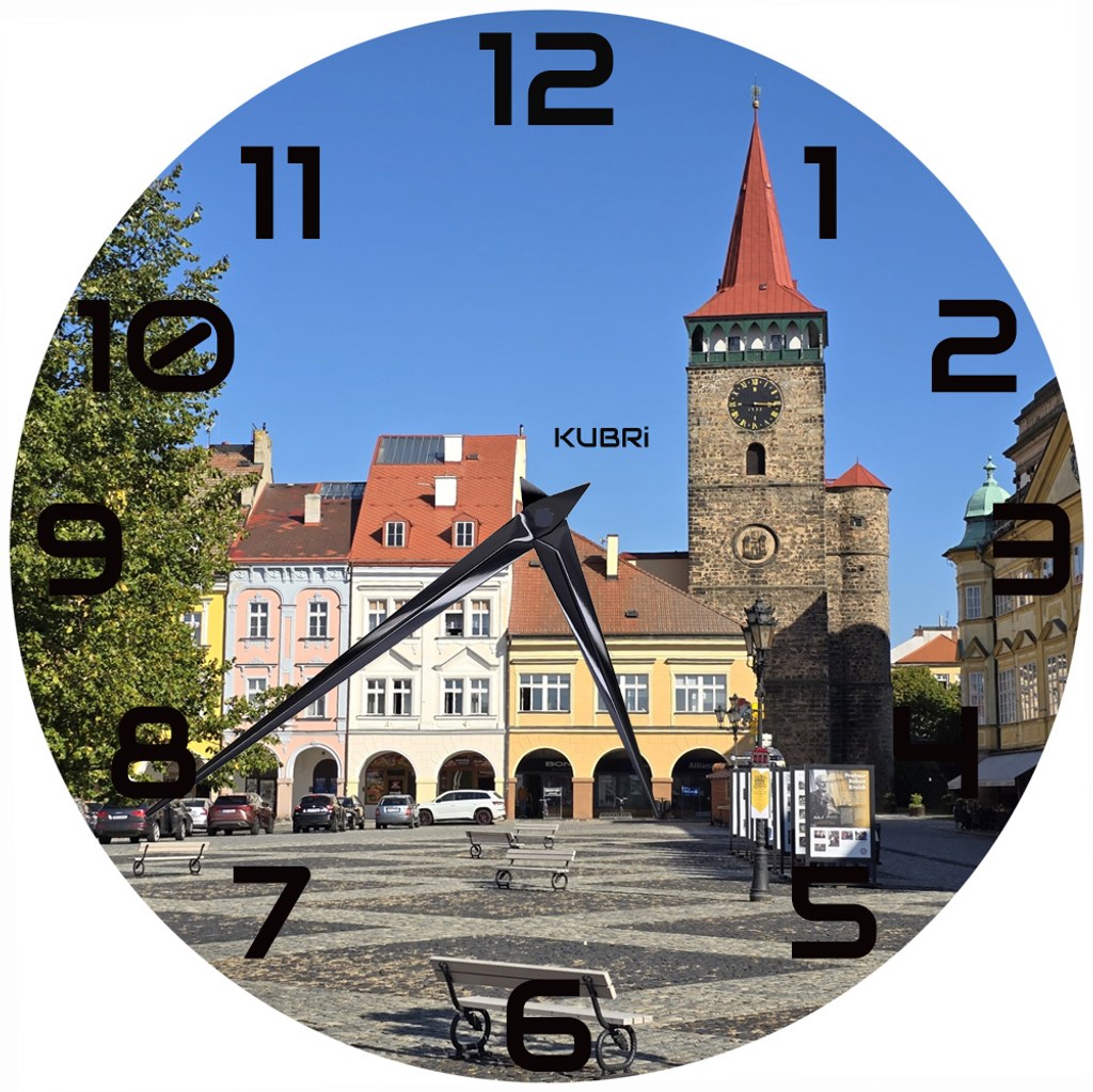 Nástěnné hodiny KUBRi s nejznámějším motivem města Jičína a to Valdickou bránou.