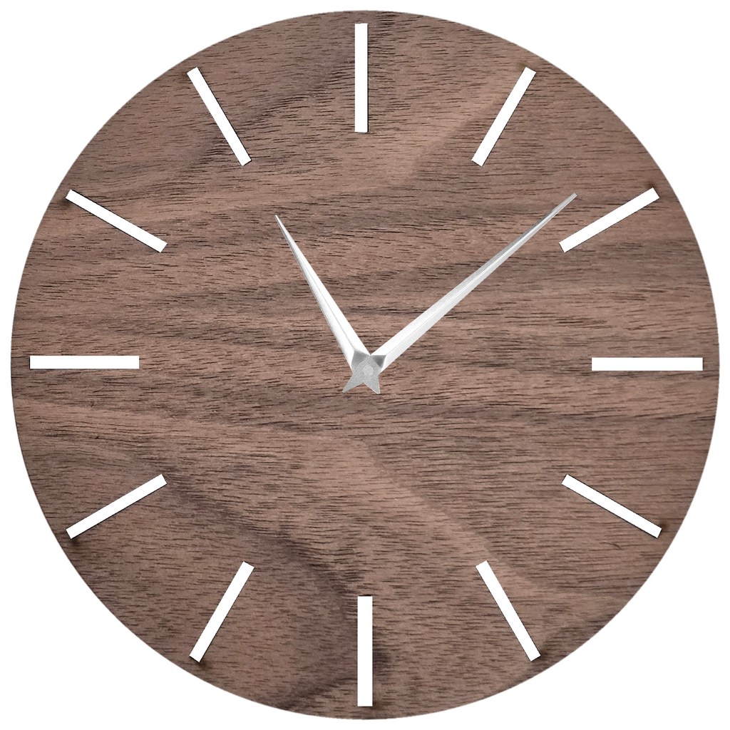 Materiál: Ořechová překližka + matné stříbrné kovové ručičky (10 cm a 15 cm varianta má ručičky černé - plastové)