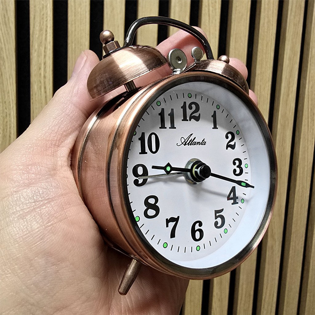 Klasický kovový mechanický budík s kovovým natahovacím strojkem. Vzbudí klasickým drnčením. Natahuje se jednou denně a na jedno natažení vydrží jít až 36 hodin.