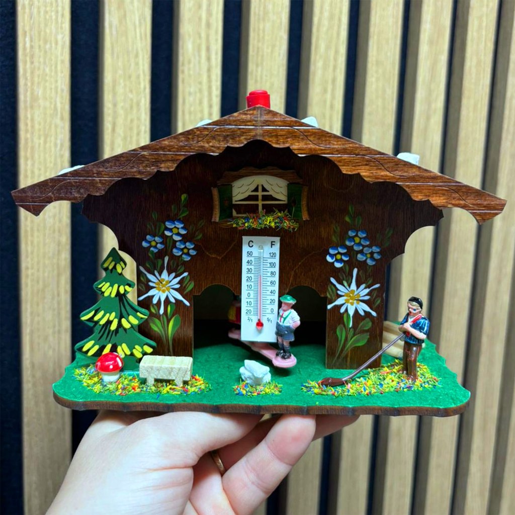 Barometr v podobě dřevěné pestrobarevné chaloupky. Bude-li hezky, z chaloupky vystoupí panenka. Bude-li ošklivé počasí, ukáže se panáček. Určeno do vnitřních prostor.