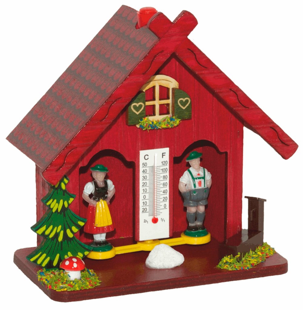 Barometr v podobě dřevěné pestrobarevné chaloupky. Bude-li hezky, z chaloupky vystoupí panenka. Bude-li ošklivé počasí, ukáže se panáček. Určeno do vnitřních prostor.