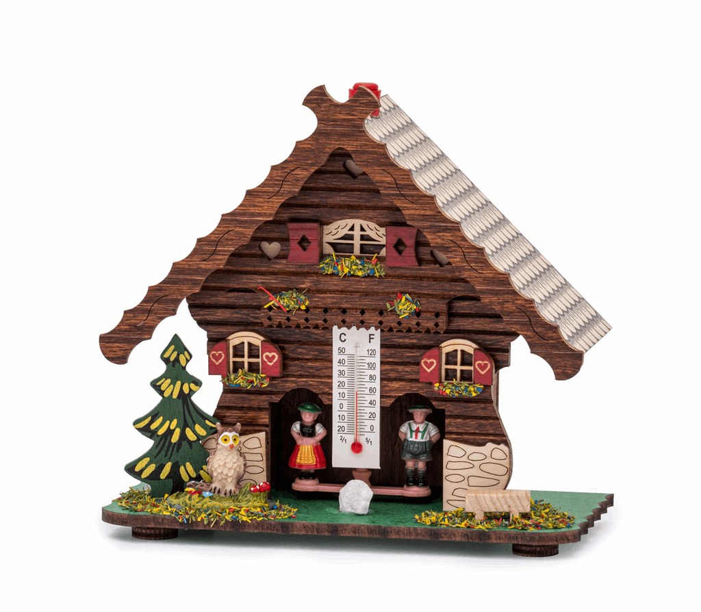 Barometr v podobě dřevěné pestrobarevné chaloupky od německého výrobce. Špičkové provedení ručně vyráběné. Bude-li hezky, z chaloupky vystoupí panenka. Bude-li ošklivé počasí, ukáže se panáček. Určeno do vnitřních prostor.