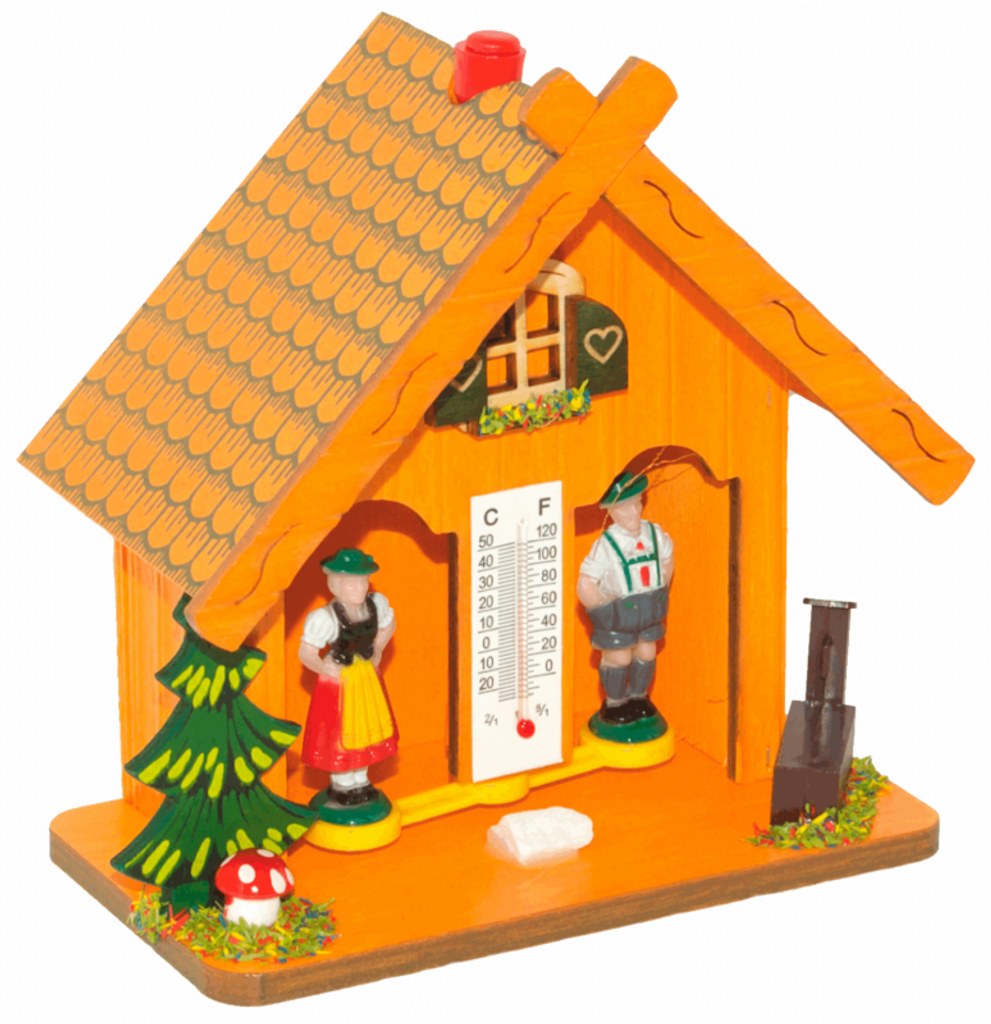 Barometr v podobě dřevěné pestrobarevné chaloupky. Bude-li hezky, z chaloupky vystoupí panenka. Bude-li ošklivé počasí, ukáže se panáček. Určeno do vnitřních prostor.