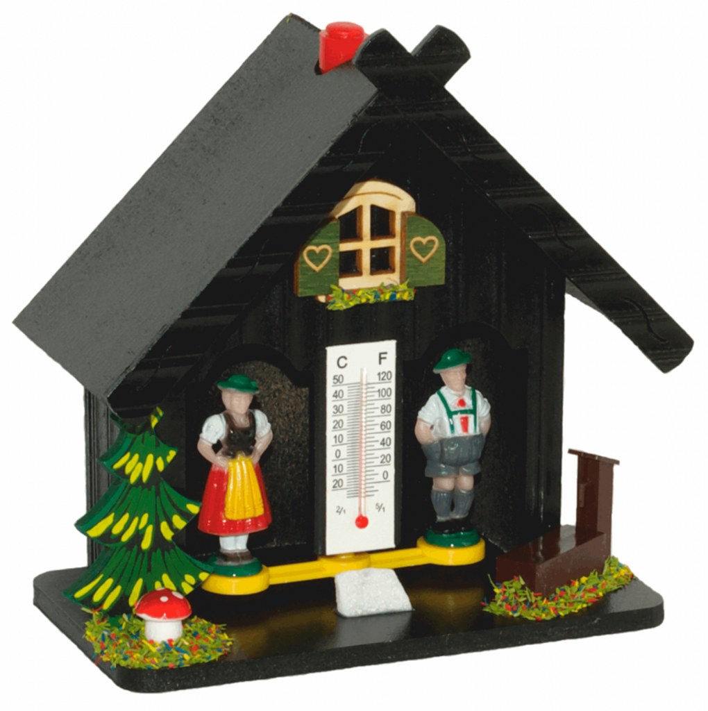 Barometr v podobě dřevěné pestrobarevné chaloupky. Bude-li hezky, z chaloupky vystoupí panenka. Bude-li ošklivé počasí, ukáže se panáček. Určeno do vnitřních prostor.
