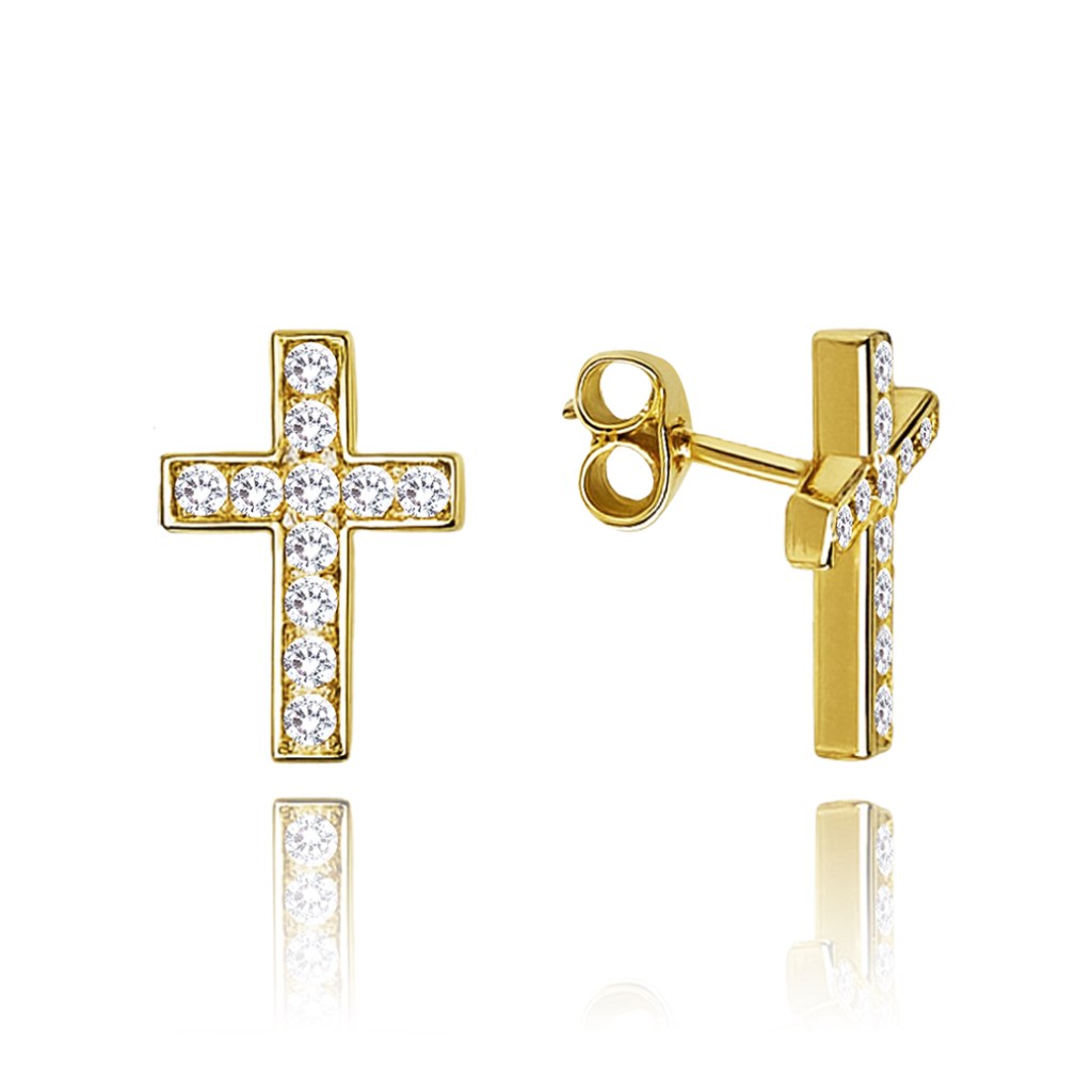 MINET Luxusní zlaté náušnice křížky s bílými zirkony Au 585/1000 1,10g