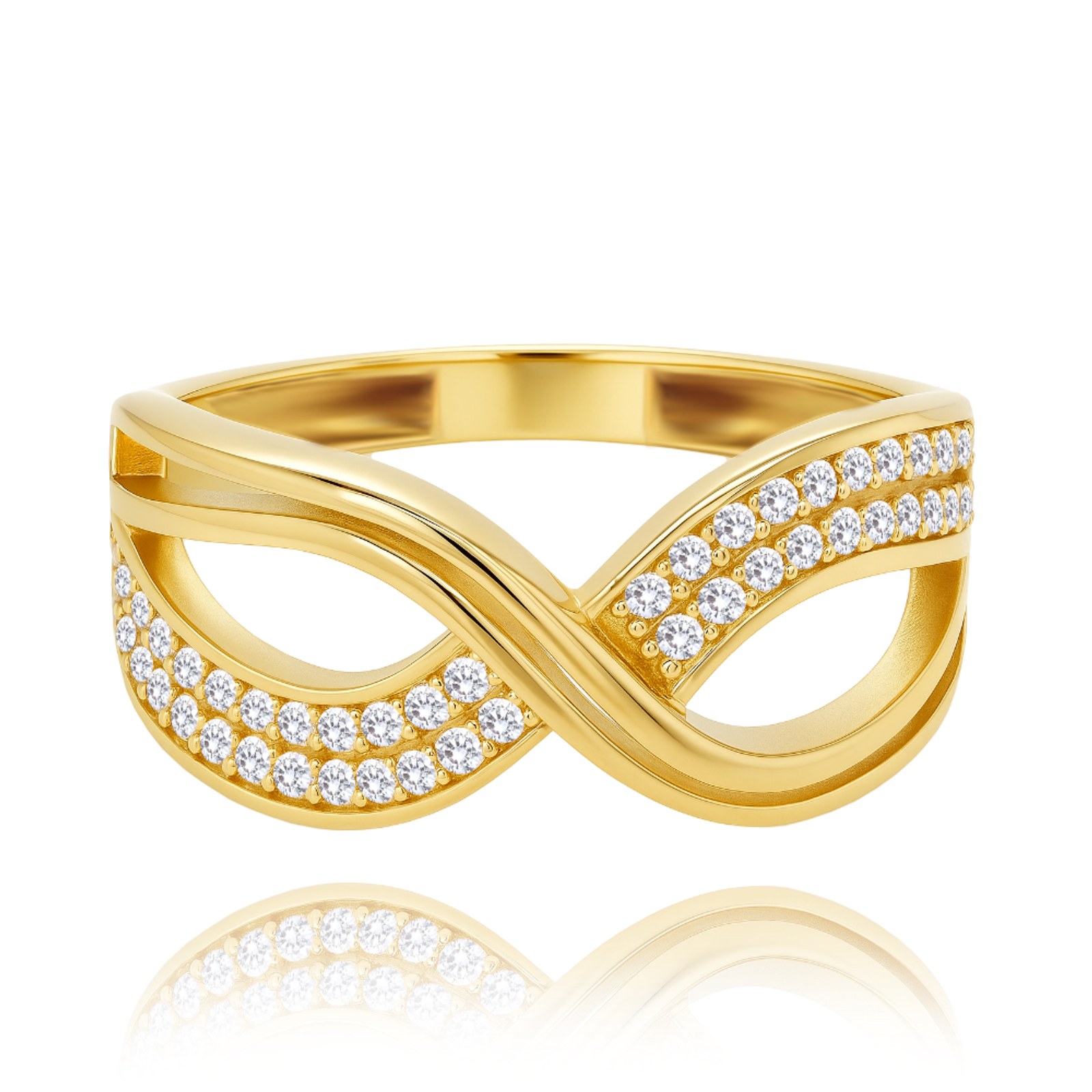 Moderní prsten z pravého 14karátového zlata s bílými zirkony. Prsten je vhodný pro každodenní nošení i zvláštní příležitosti. Kvalitního zpracování si všimnete hned po prvním nošení.