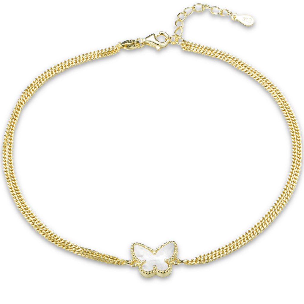MINET Pozlacený stříbrný řetízek na kotník motýlek s bílou perletí
