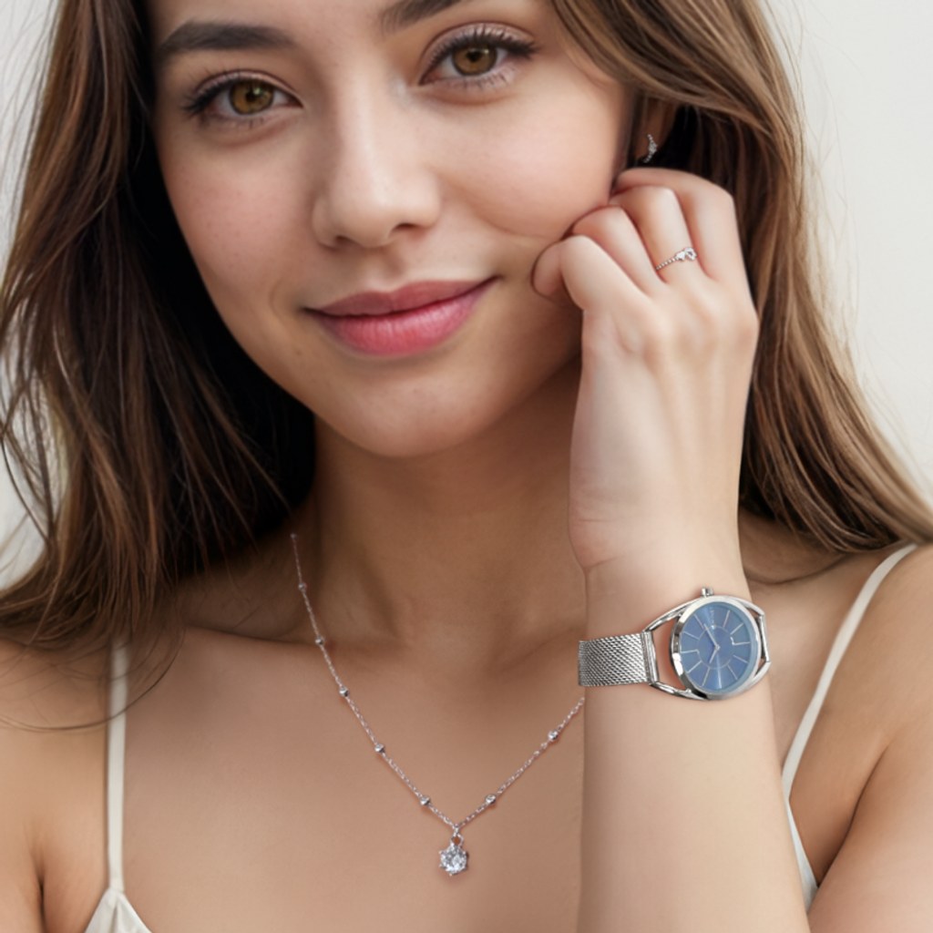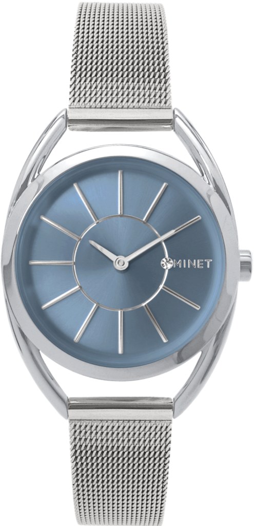 Elegantní hodinky české značky MINET s modrým číselníkem a moderním ocelovým řemínkem milánského typu ve stříbrné barvě. Vyměnitelný řemínek se snadným systémem zkracování se přizpůsobí obvodu ruky. Hodinky jsou vyrobeny z hypoalergenní nerezové oceli.