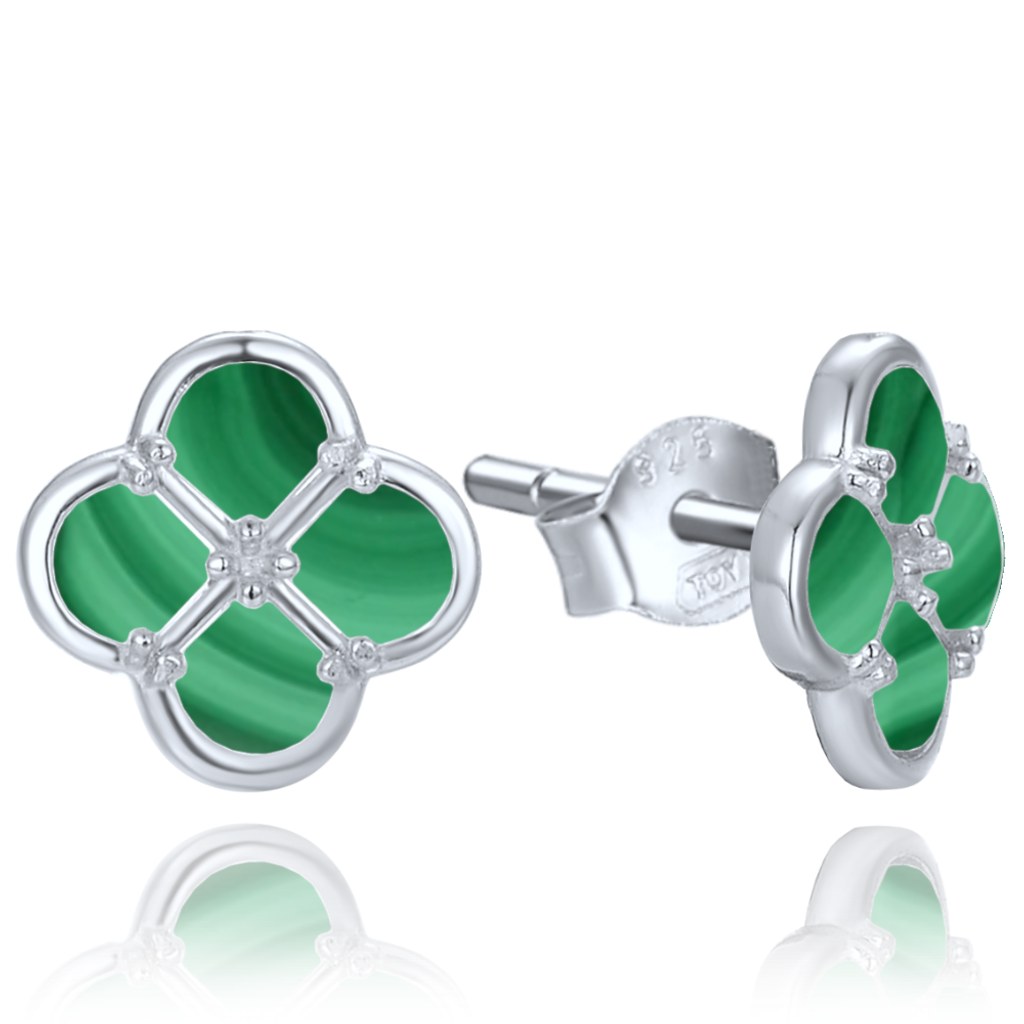 MINET Stříbrné náušnice čtyřlístky s malachitem