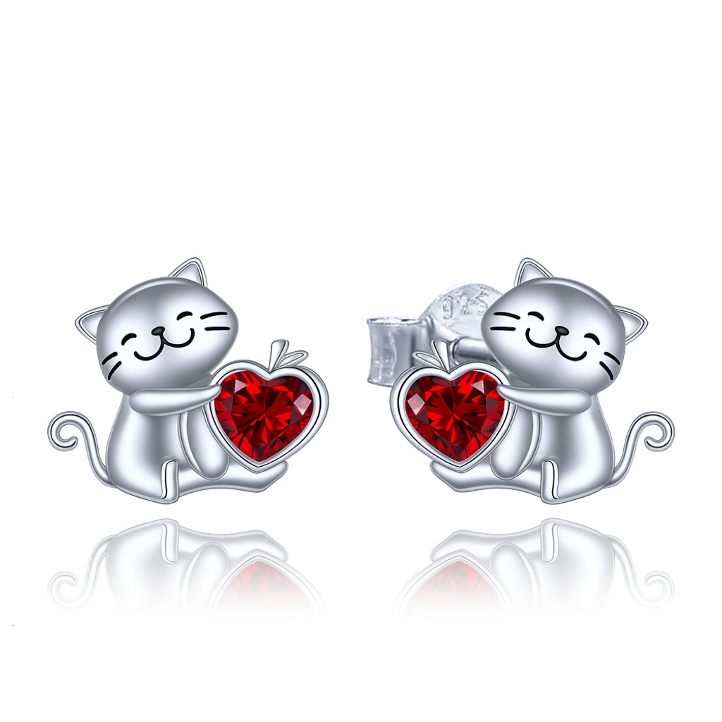 MINET Stříbrné náušnice kočky se srdíčkem s červenými zirkony