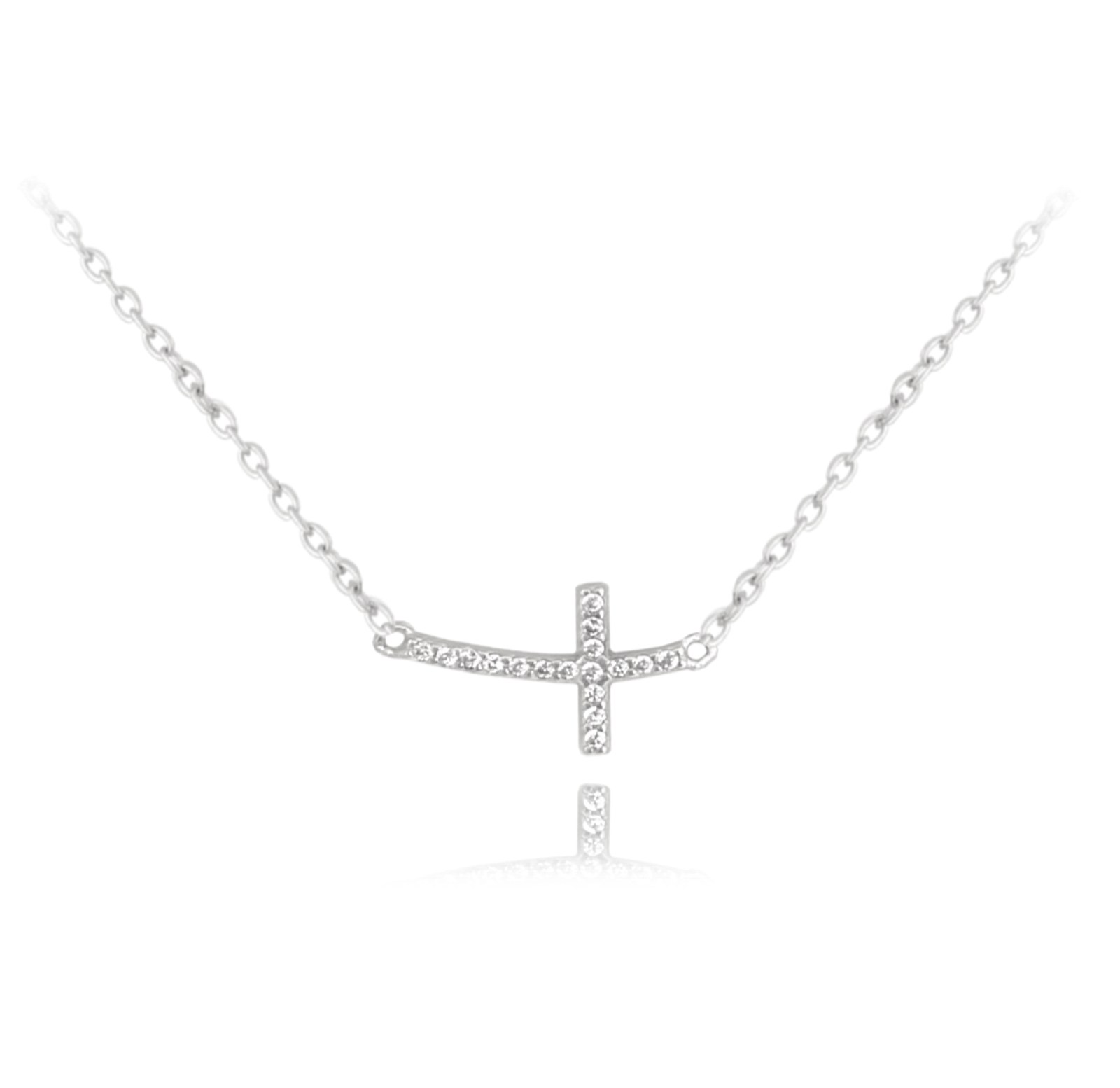 MINET Stříbrný náhrdelník drobný ležatý křížek se zirkony