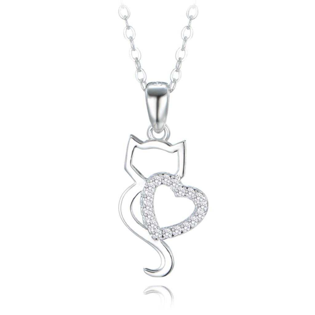 MINET Stříbrný náhrdelník kočka se srdíčkem a bílými zirkony
