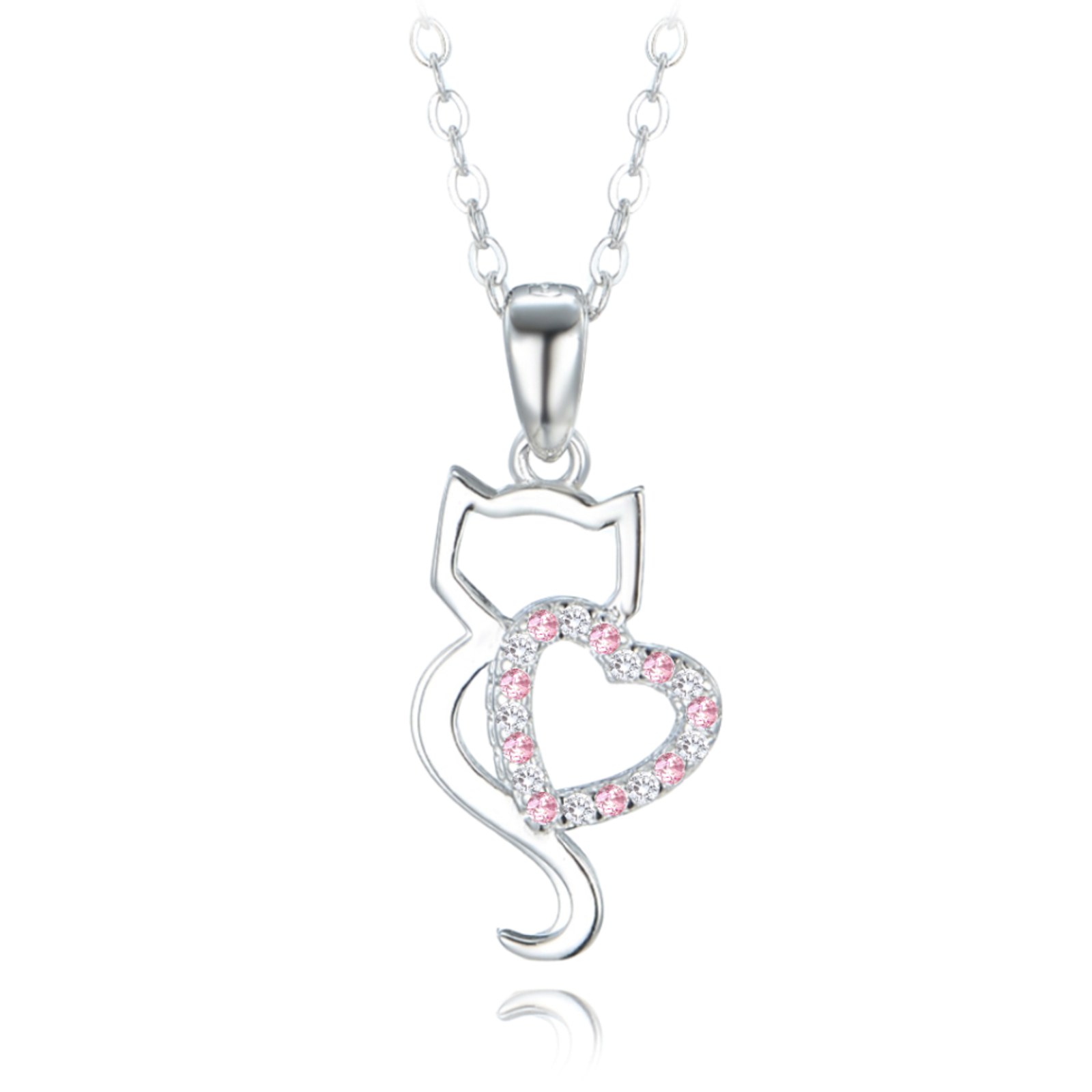 MINET Stříbrný náhrdelník kočka se srdíčkem s bílými a růžovými zirkony