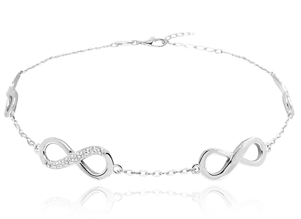 Stříbrný náramek MINET se symboly nekonečna je odrazem současných trendů. Zajímavě posazené kamínky z něj originální udělají doplněk pro každodenní nošení.