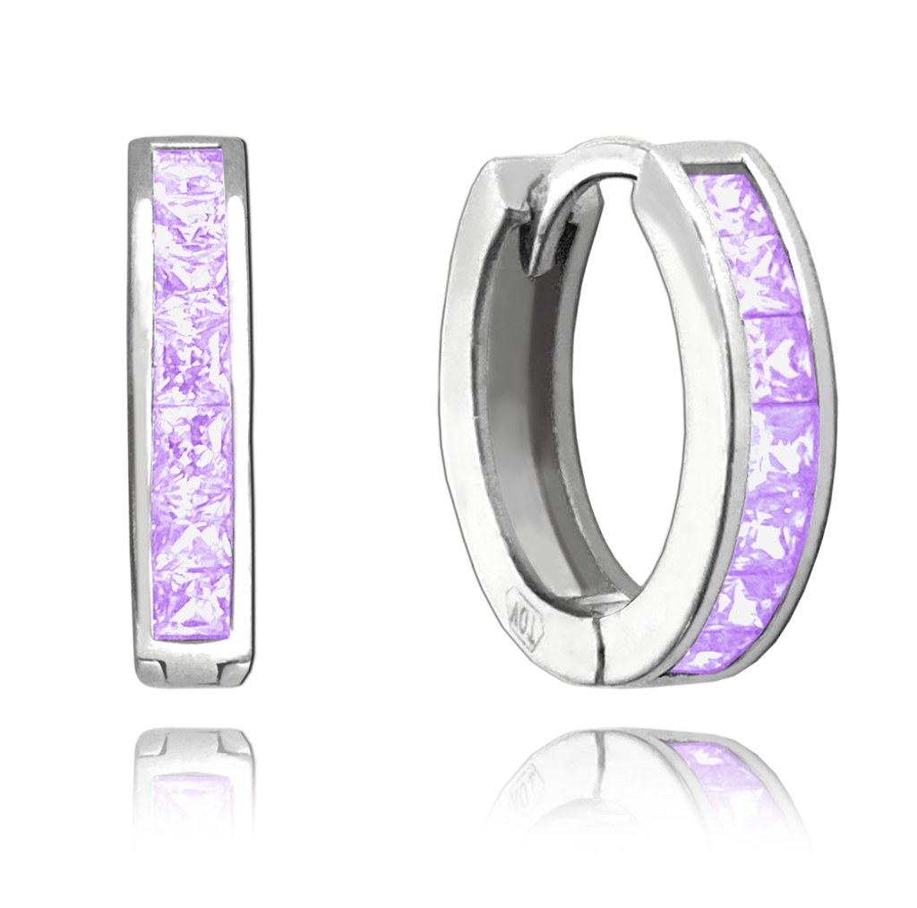 Světle fialové náušnice kroužky jsou díky praktickému zapínání a tvaru pohodlné pro každodenní nošení. Fialové zirkony se krásně třpytí a ozvláštníte jimi svůj outfit. Povrch stříbra je z rhodia, náušnice tedy neztratí svůj zářivý lesk a barvu.