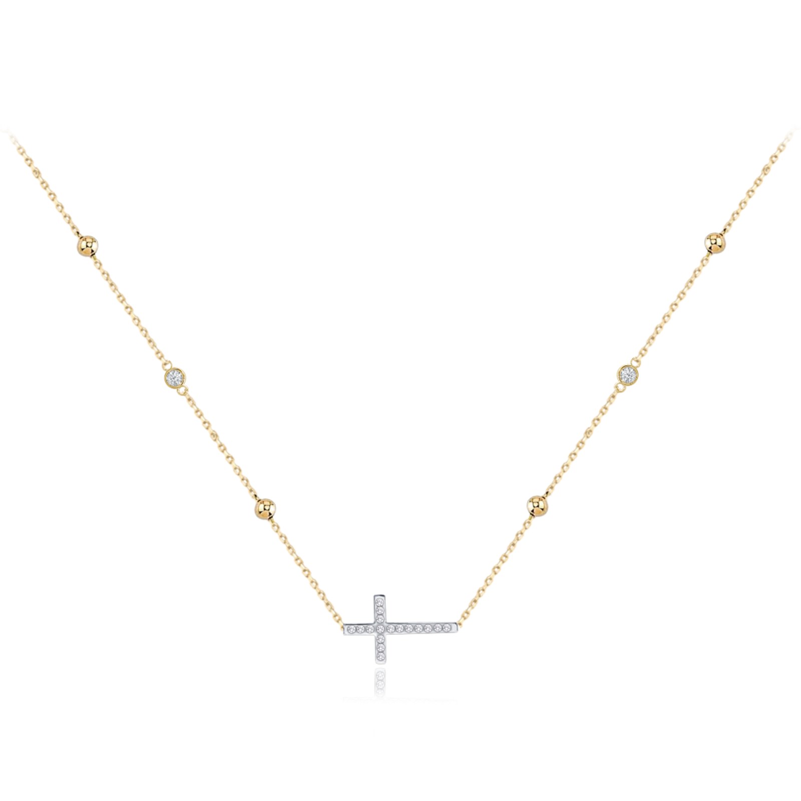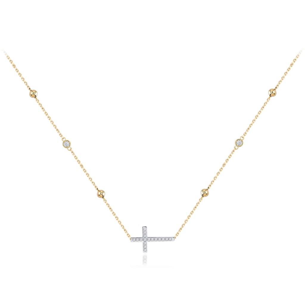 MINET Zlatý náhrdelník křížek s bílými zirkony a kuličkami Au 585/1000 3,90g