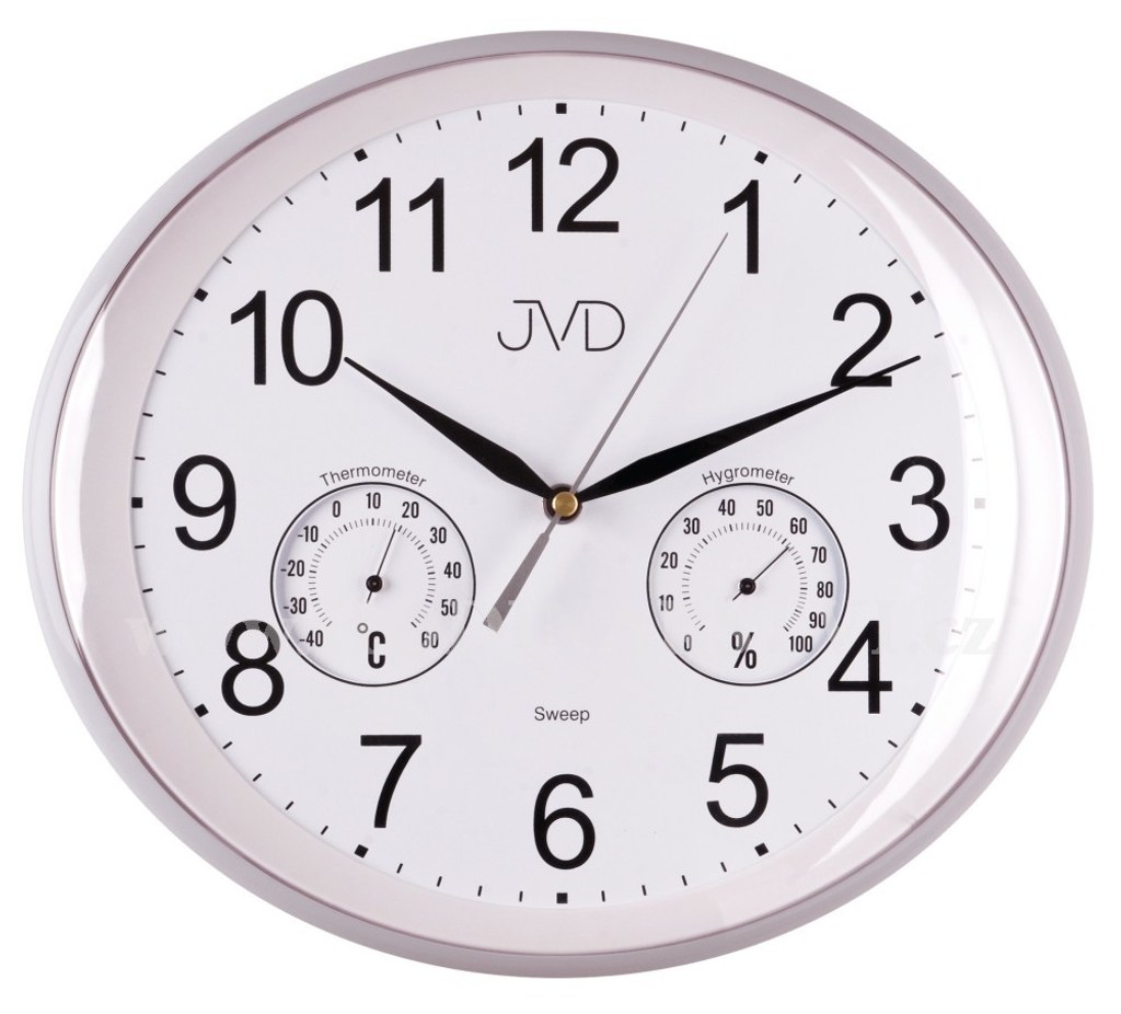 Moderní plastové hodiny značky JVD oválného tvaru v populárních univerzálních barvách s plynulým chodem. Zajisté oceníte také vestavěný teploměr a vlhkoměr.