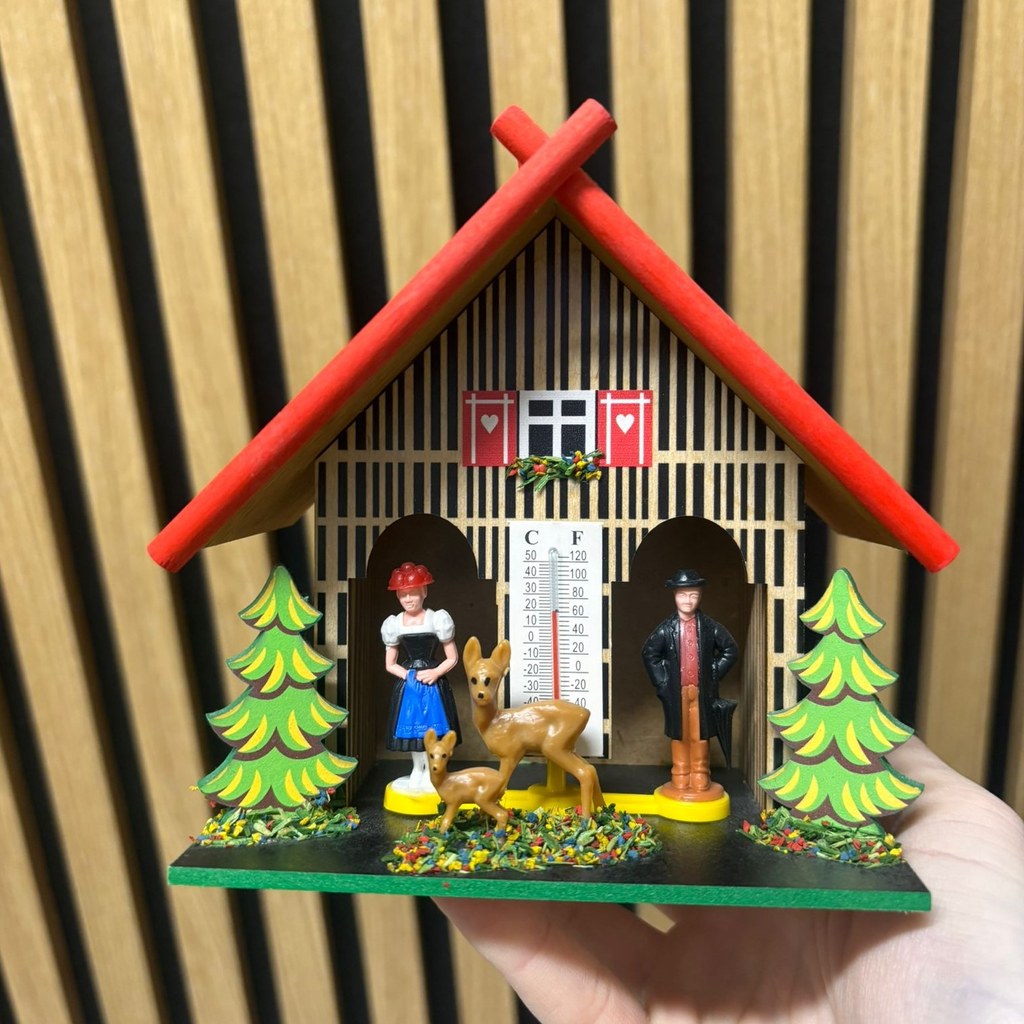 Barometr v podobě dřevěné pestrobarevné chaloupky. Bude-li hezky, z chaloupky vystoupí panenka. Bude-li ošklivé počasí, ukáže se panáček. Chaloupka je vybavena teploměrem. Určeno do vnitřních prostor.